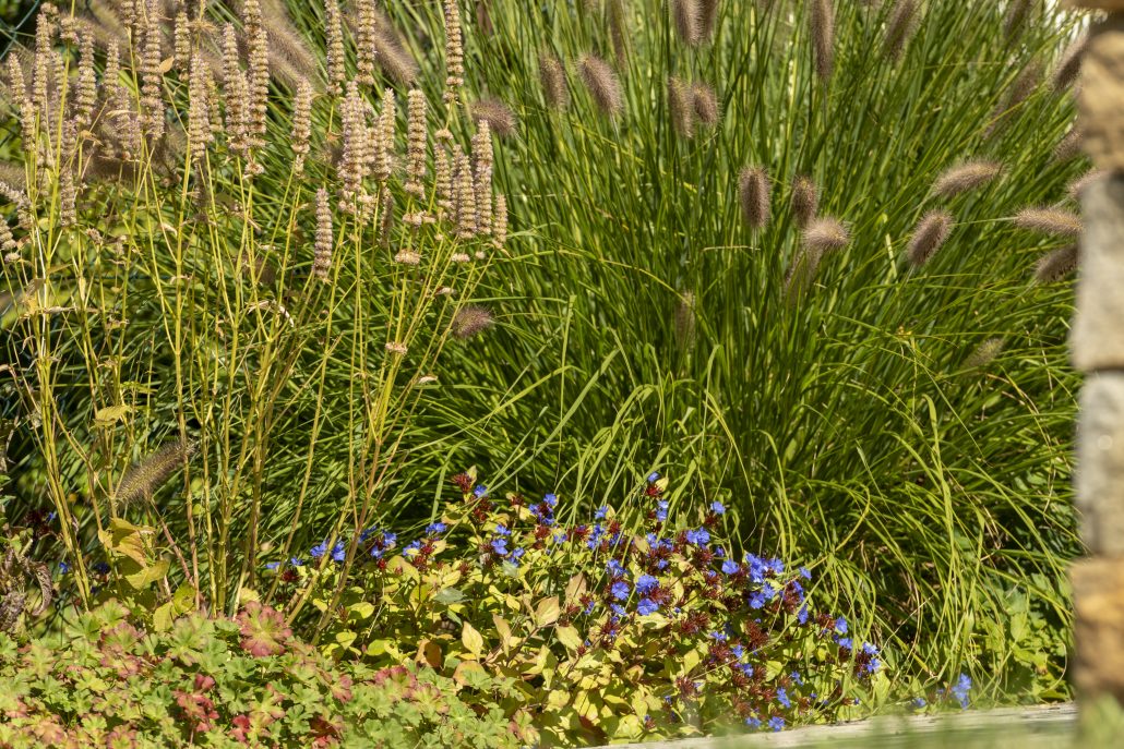 Die bereits vorhandenen Hecken um das Grundstück blieben natürlich erhalten. Eine üppige, dichte Stauden- und Gräserbepflanzung um die erhöhte Terrasse und entlang des Zugangswegs rahmen die Belagsflächen ein und bieten zu jeder Jahreszeit „eyecatcher“ im Garten.
